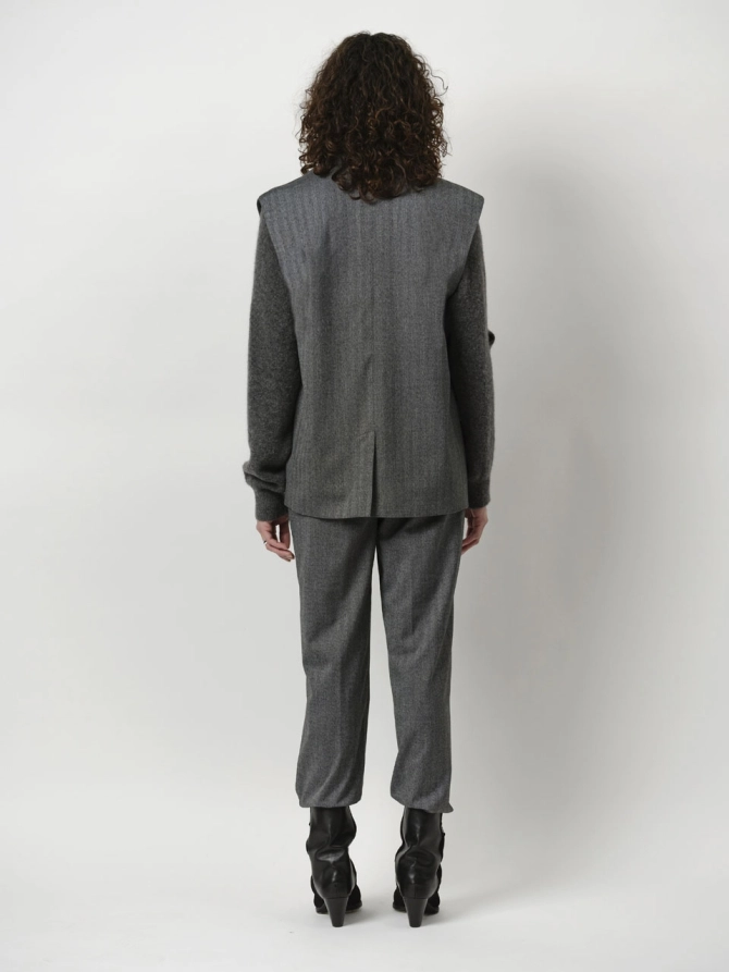 Maak een statement met ons oversized gilet Avenue in de grijze kleur Graphite. Deze klassieke stijl met een moderne twist is single breasted en heeft een relaxte pasvorm. De sterke schouders met schoudervullingen zorgen ervoor dat je outfits opvallen. Draag het met de bijpassende herringbone broek, bustier en ons korte vest Salessy voor de ultieme gelaagde look.
