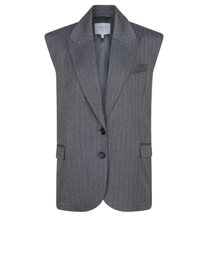 Maak een statement met ons oversized gilet Avenue in de grijze kleur Graphite. Deze klassieke stijl met een moderne twist is single breasted en heeft een relaxte pasvorm. De sterke schouders met schoudervullingen zorgen ervoor dat je outfits opvallen. Draag het met de bijpassende herringbone broek, bustier en ons korte vest Salessy voor de ultieme gelaagde look.