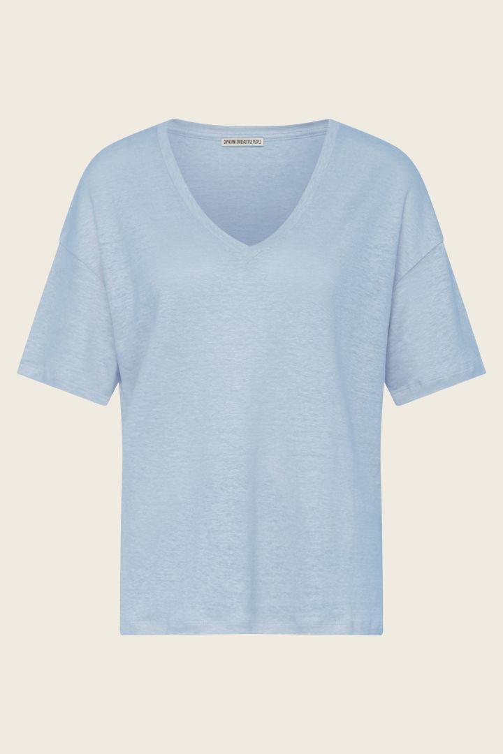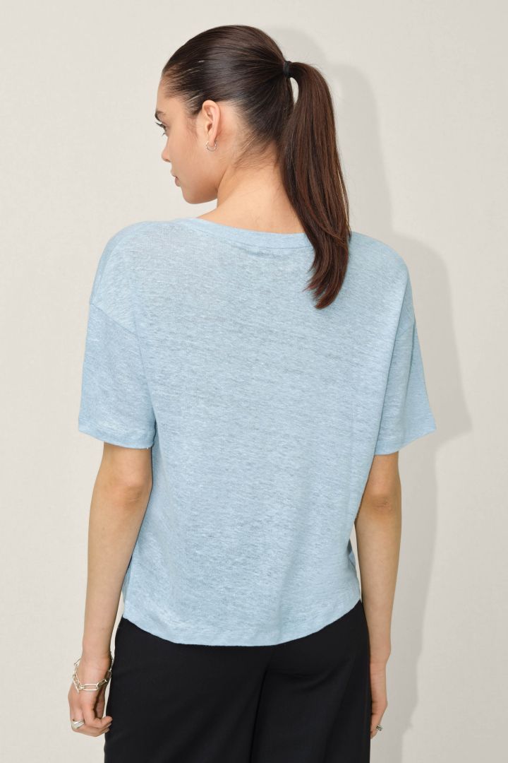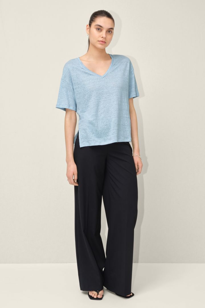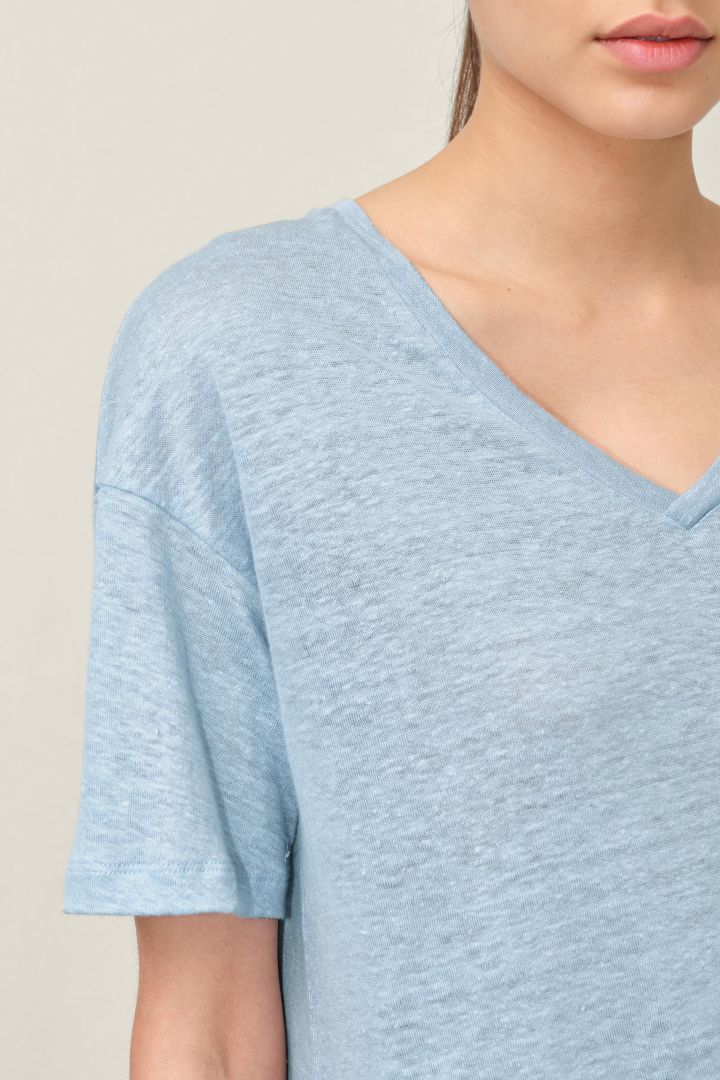 relaxed fit straight shape v-hals 100% linnen model draagt maat S and is 179 made with linen